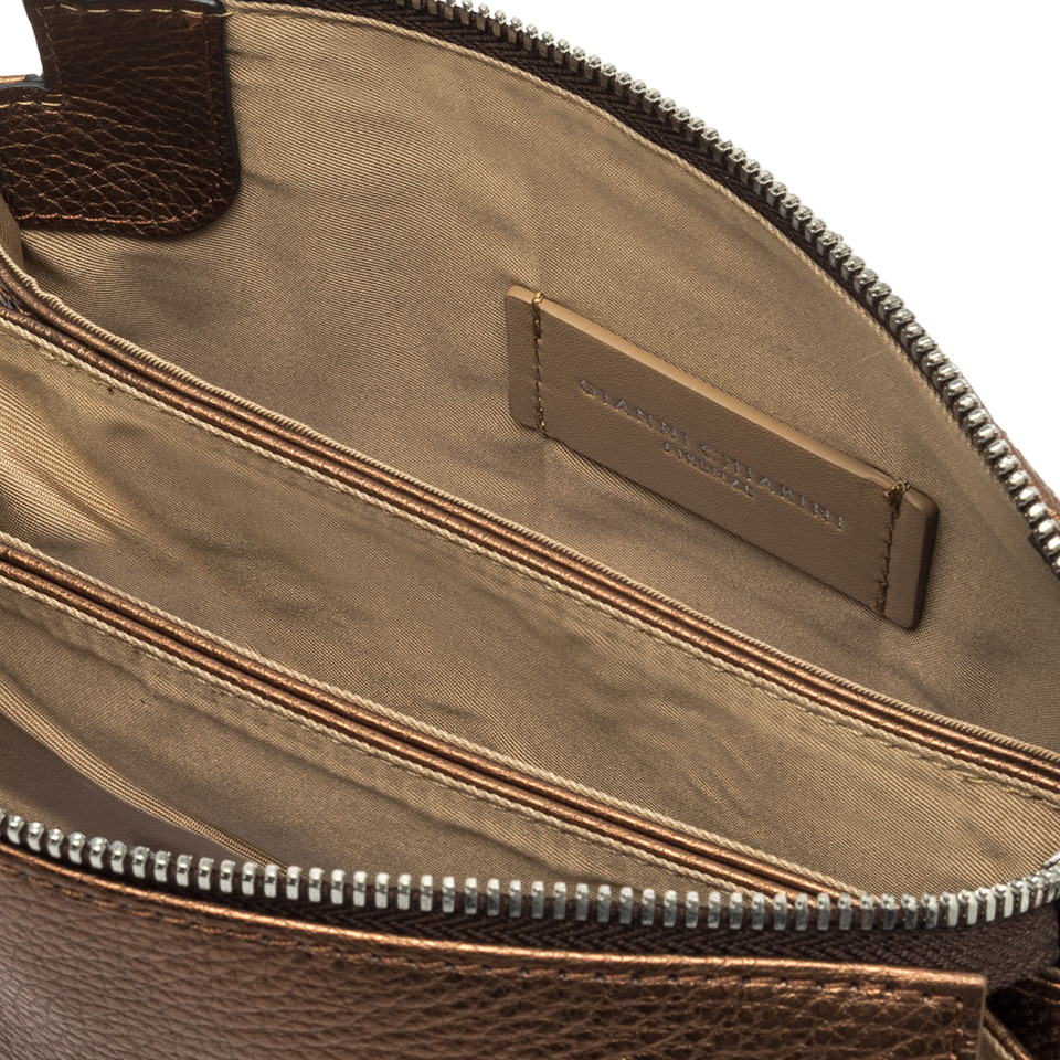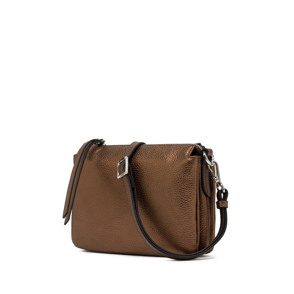 Da portare a mano o con la sottile tracolla in pelle, la borsa Three by Gianni Chiarini Firenze è realizzata in pregiata pelle martellata laminata. Giovane e divertente, presenta un design innovativo che si distingue per le zip a contrasto nella parte superiore. Perfetta per outfit casual, ma anche per serate eleganti. Dimensioni: 20x12x8 cm.
