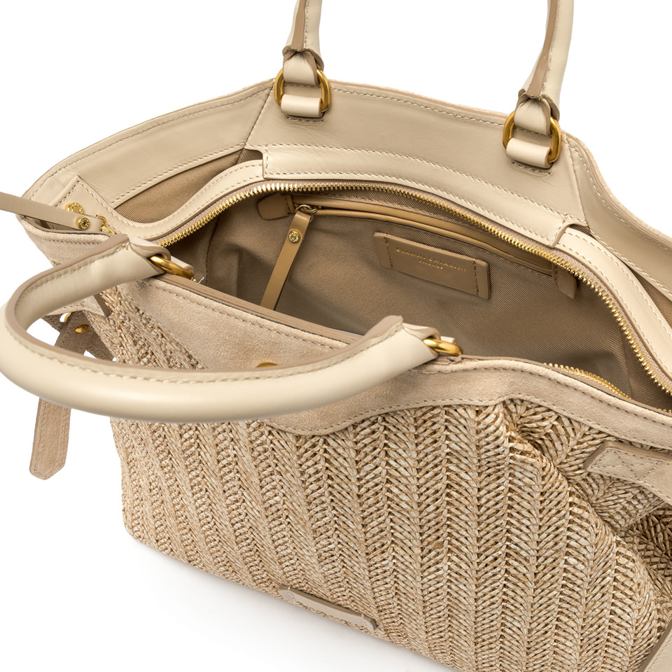 Claudette è una borsa dalla silhouette pratica e versatile, realizzata in paglia intrecciata evoca un fascino rustico chic, con profili in pelle scamosciata. I dettagli in metallo aggiungono lucentezza, mentre i due manici in pelle e la tracolla regolabile offrono una doppia portabilità: a mano e crossbody. Perfetta per un tocco estivo elegante e funzionale. Dimensioni: 33x24x14 cm.