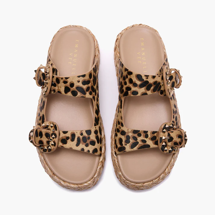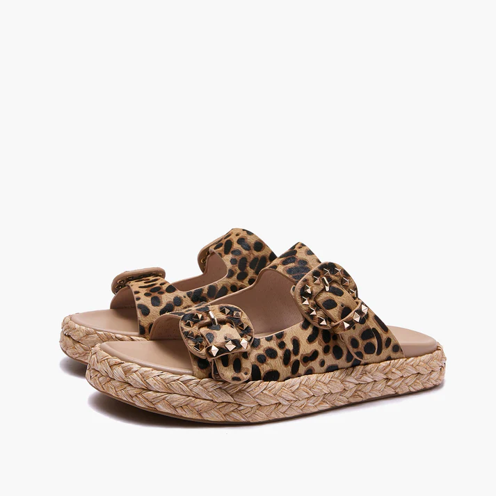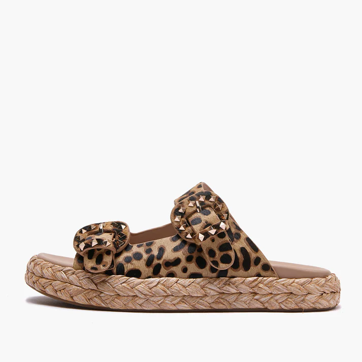 Mules in Pelle, caratterizzato dal cavallino maculato, fibbie con contorno borchiato e la sua sola in gomma.