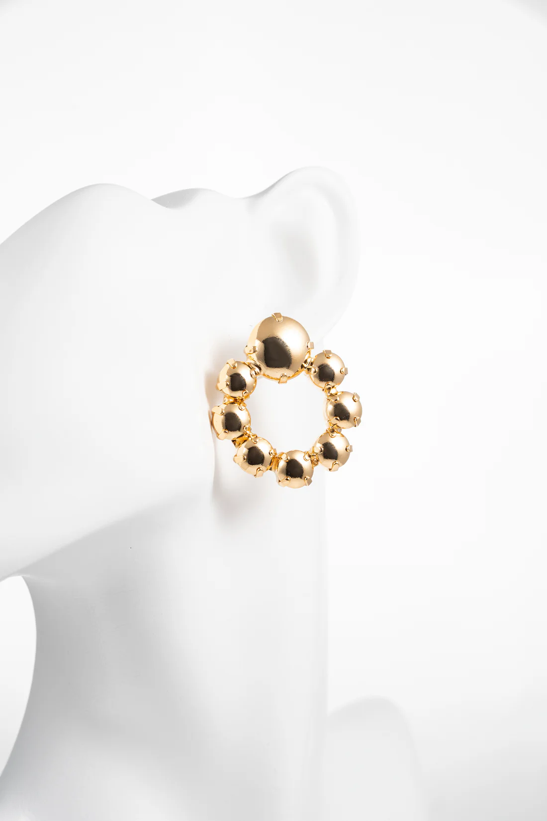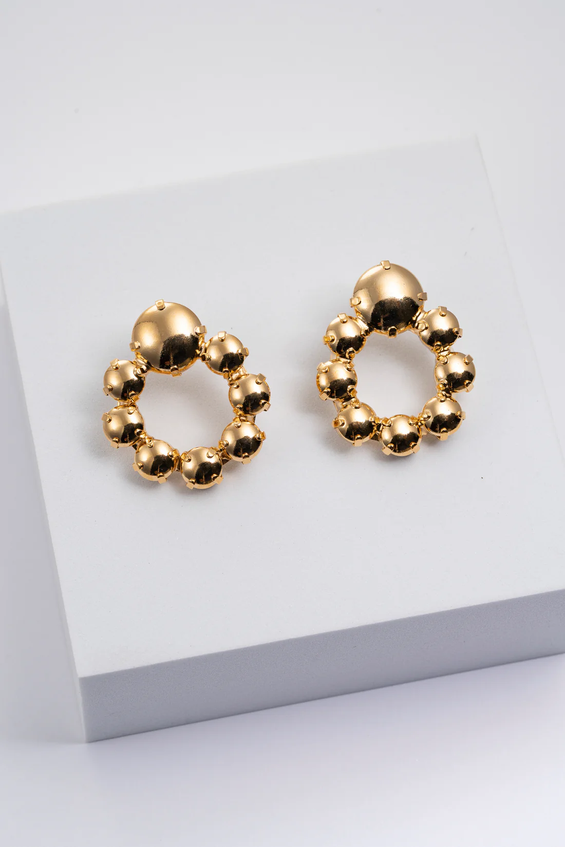 Gli orecchini Orbis incarnano armonia e movimento, con un design che richiama la perfezione del cerchio e la luminosità delle sfere dorate. Ogni elemento riflette la luce creando un effetto brillante e sofisticato, ideale per valorizzare qualsiasi outfit.