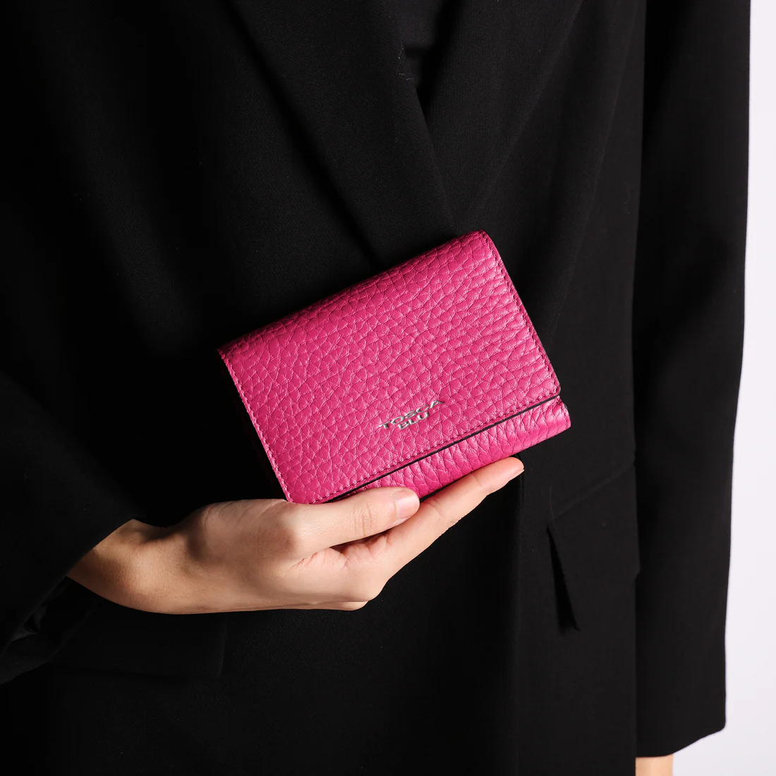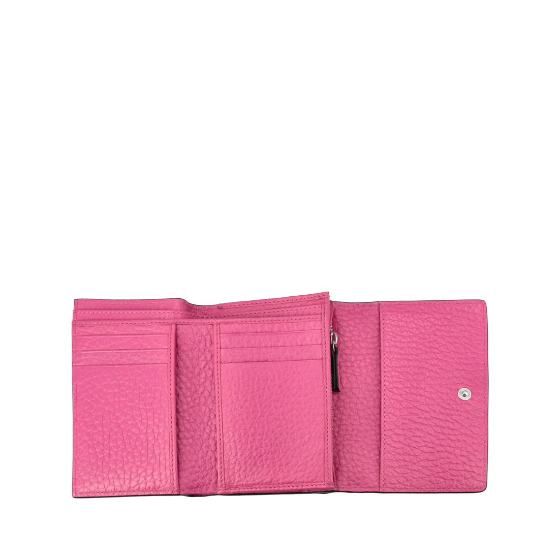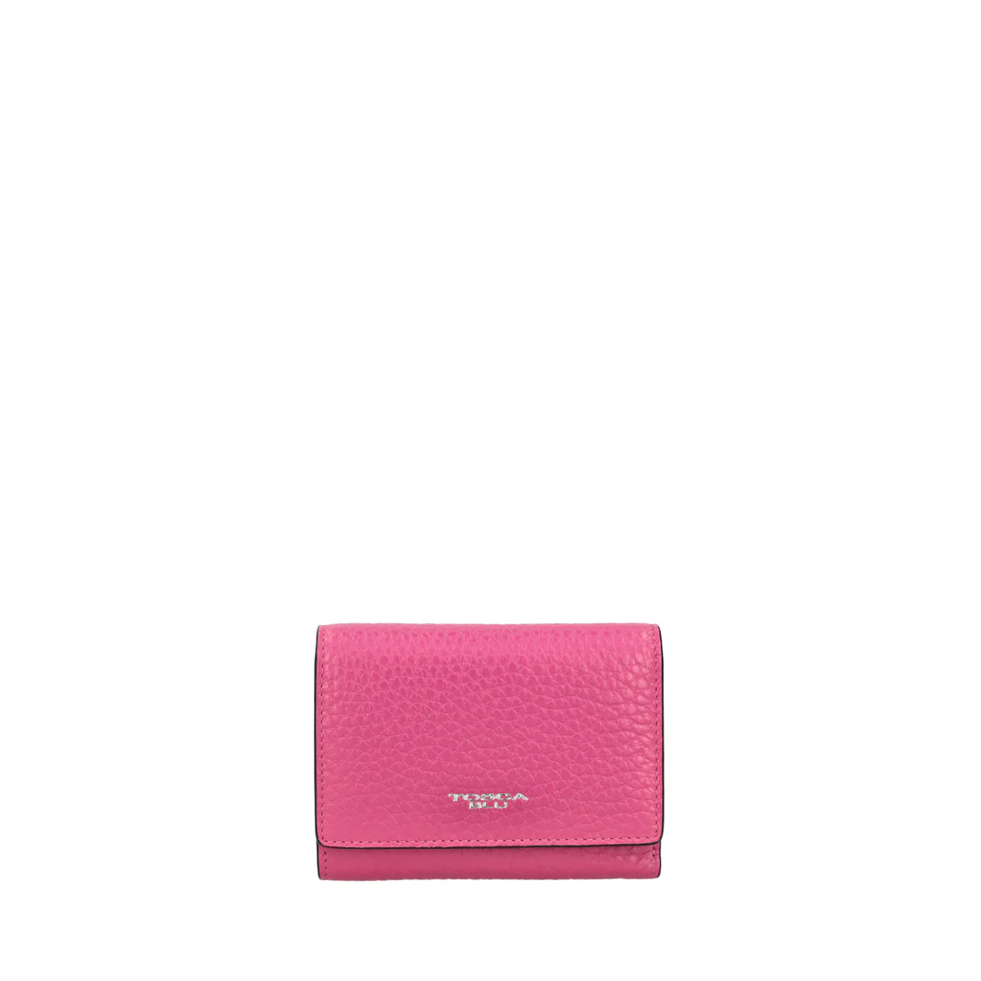 Questo portafoglio medio in pelle firmato Tosca Blu è un accessorio compatto e capiente. Realizzato interamente in morbida pelle colore fucsia, è dotato di chiusura con bottone che custodisce tre scomparti interni, un portamonete con zip e dieci slot portatessere. A completare il design del portafoglio medio in pelle è il logo frontale, dettaglio distintivo che aggiunge un tocco di riconoscibilità e raffinatezza.