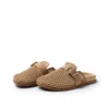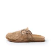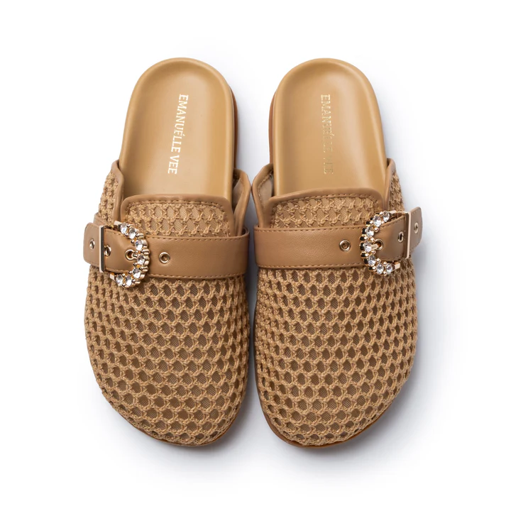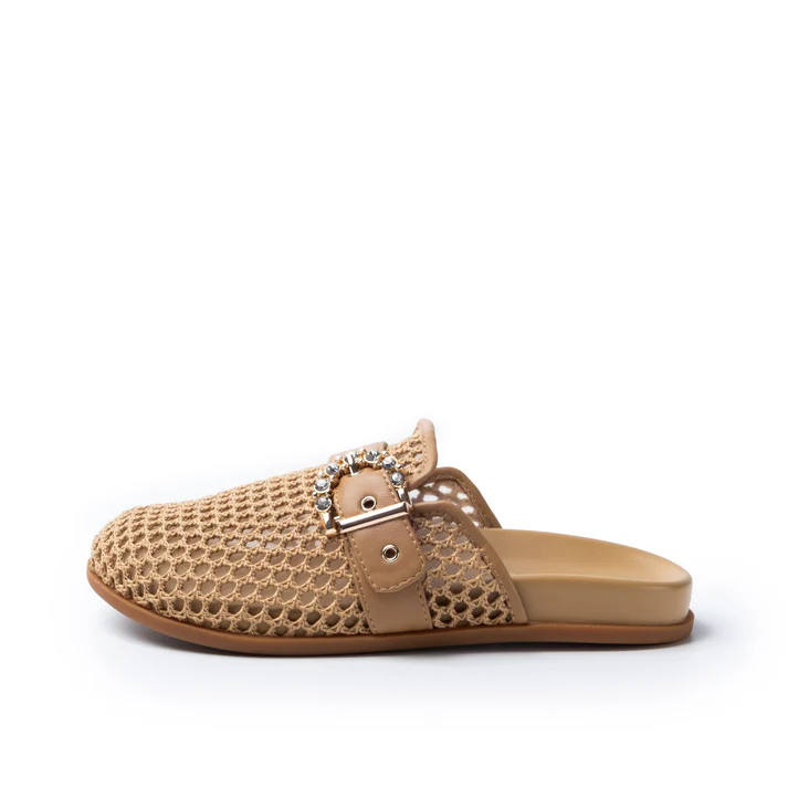 Il Sabot “Benedit” è realizzato in raffia retinata con dettaglio della fibbia in strass.