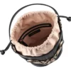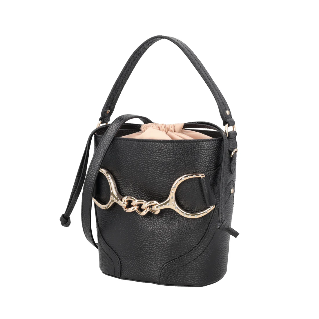 Lasciati conquistare dal fascino senza tempo di questo secchiello in pelle. Declinato in color nero, il modello è realizzato interamente in morbida pelle e si distingue grazie all’iconico morsetto dorato con strass che ne illumina il design. La borsa secchiello dispone di una chiusura a coulisse in tessuto e di una comoda tracolla per indossarla crossbody. Abbina il tuo secchiello in pelle ai tuoi outfit quotidiani e aggiungi un tocco di raffinatezza senza rinunciare alla praticità.