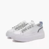 Sneaker a cassetta in pelle con dettagli in glitter color cielo e pelle bianca a contrasto, decoro strass sull’allacciatura.