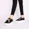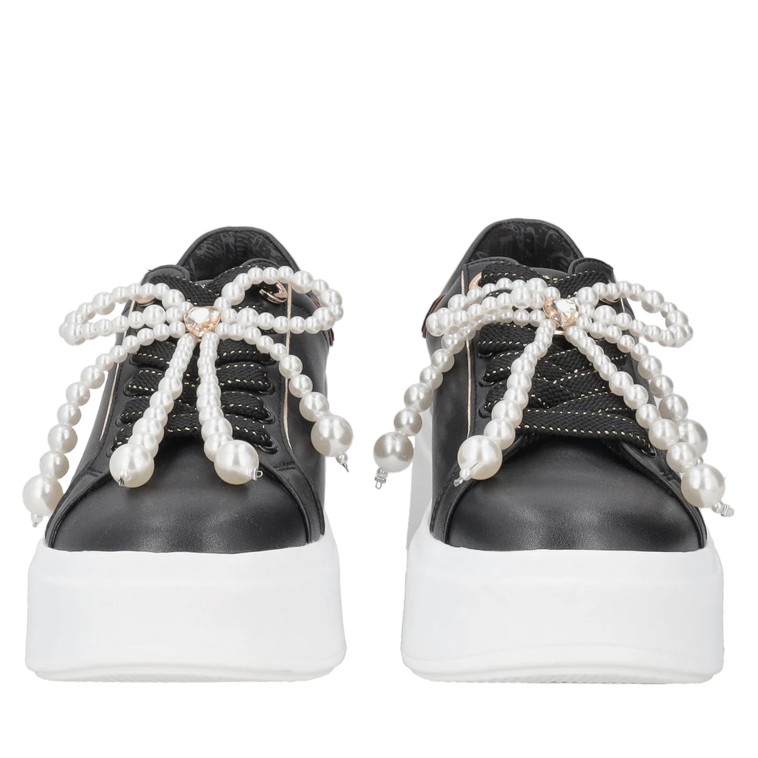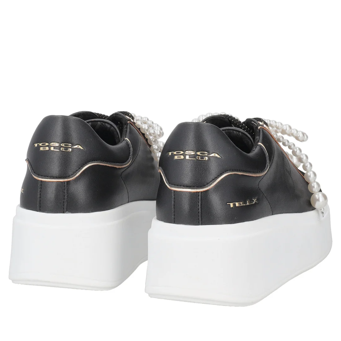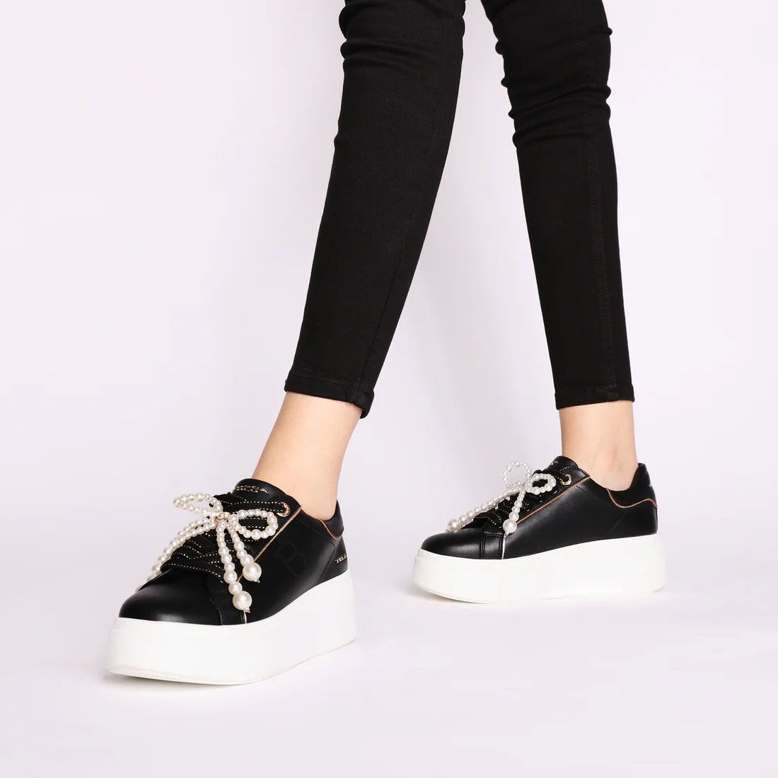 Abbraccia l’unione perfetta tra comfort e moda con questa sneaker in pelle di Tosca Blu. Il modello, dedicato alla donna che desidera distinguersi, è realizzato in pelle di colore bianco. Queste non sono solo scarpe, sono un gioiello: il fiocco ornamentale, composto da una luminosa cascata di perle, trasforma le tue sneakers in pelle in un accessorio glamour. La suola platform, audace e confortevole, slancia la figura, mentre i dettagli oro lungo i profili aggiungono un tocco di lusso discreto.