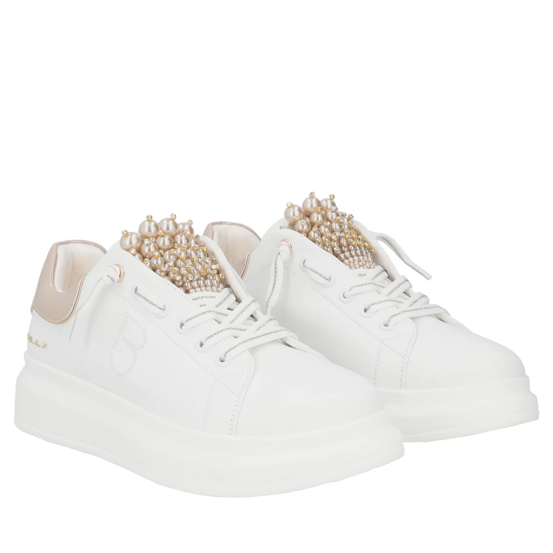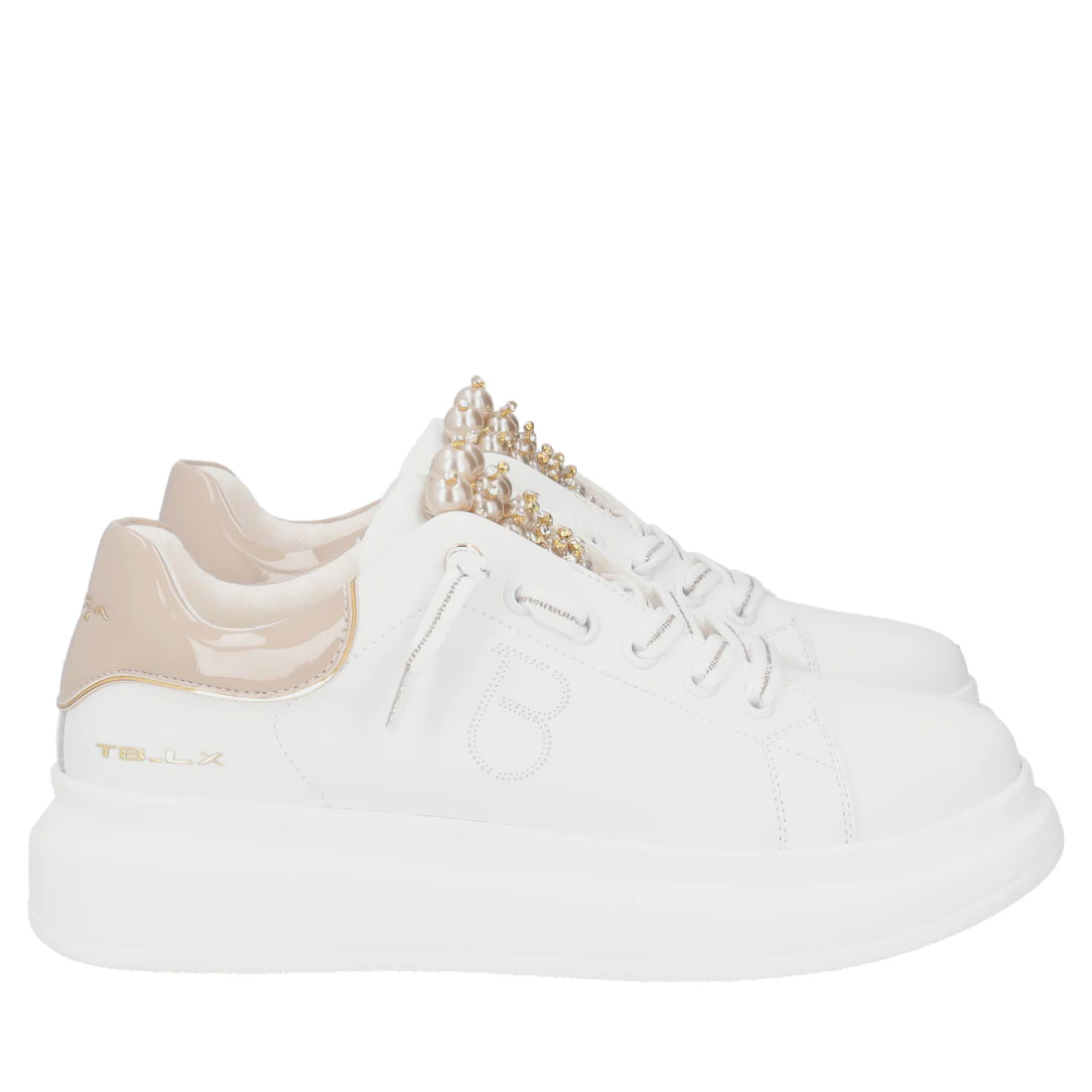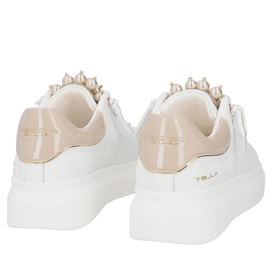 Rendi speciali le tue occasioni con questa sneaker in pelle bianca e beige. Tosca Blu disegna questo modello con linguetta arricchita da perle, dettagli glamour che conquistano al primo sguardo. Con suola platform alta, imbottitura interna e monogramma traforato sul fianco è una sneaker in pelle ideale per chi ama distinguersi con gusto. Abbinala con qualsiasi outfit, dai jeans ai vestiti più formali.