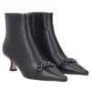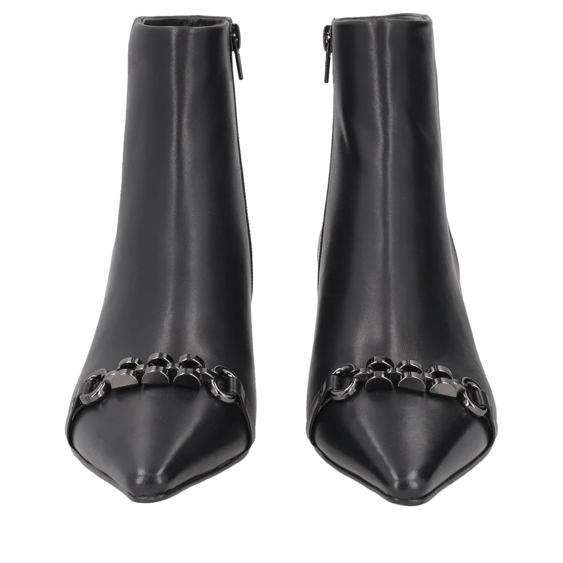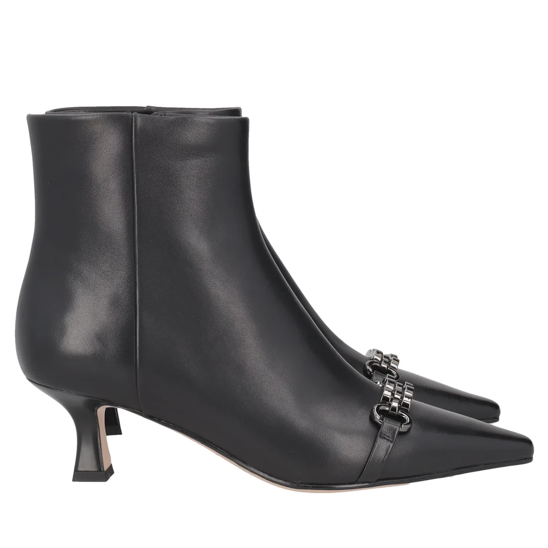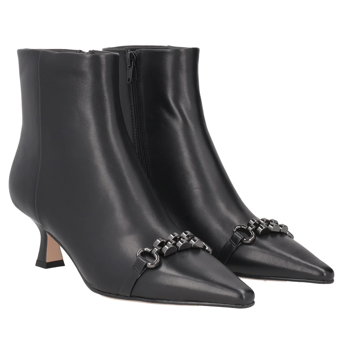 Aggiungi un tocco di raffinatezza ai tuoi look indossando questo stivaletto in pelle color marrone con tacco. Il design sofisticato, impreziosito dalla fibbia dorata, lo rende perfetto per le tue occasioni speciali. Il tacco di altezza 6 cm e la punta allungata dello stivaletto in pelle slanciano la tua figura accompagnandoti con stile, di giorno e di sera.