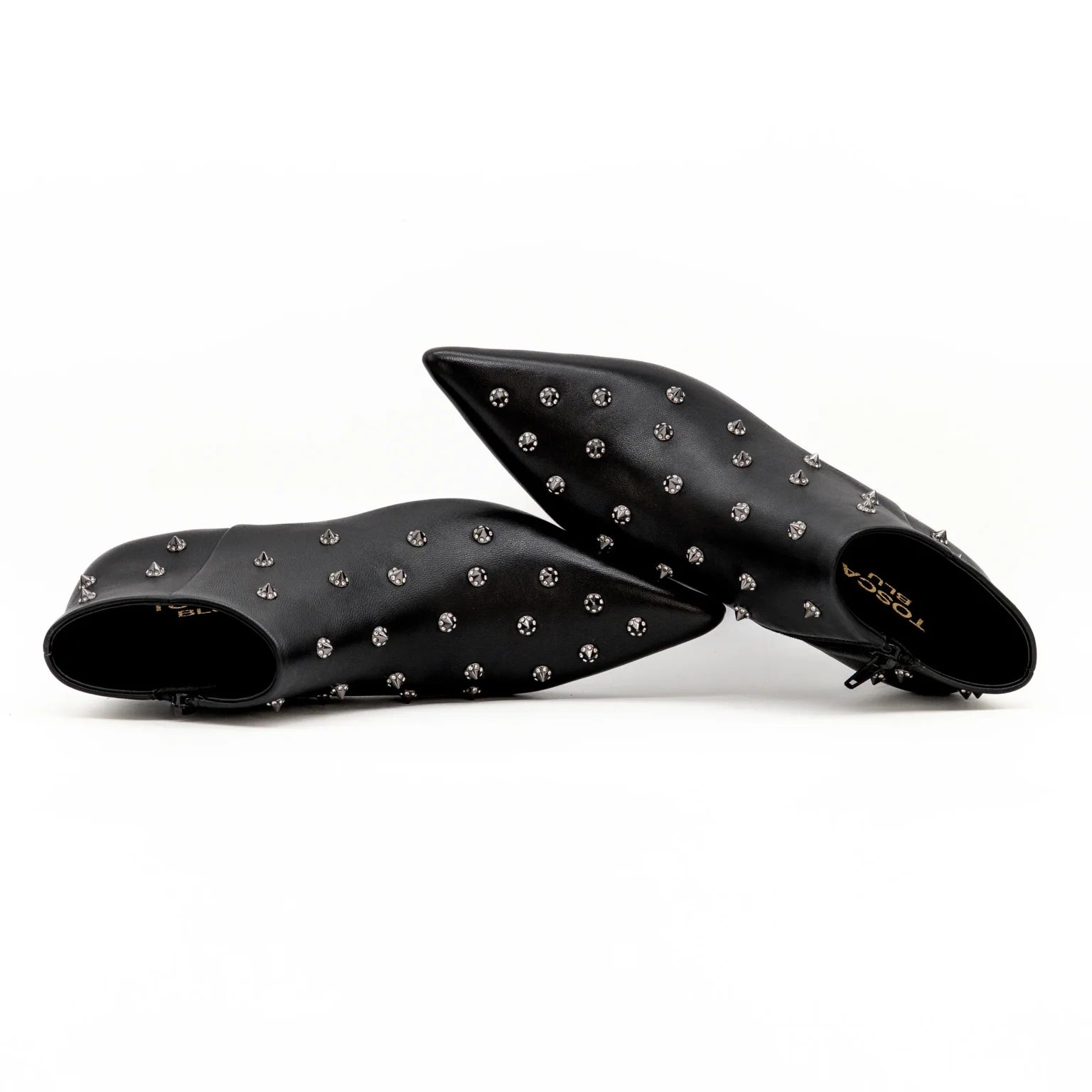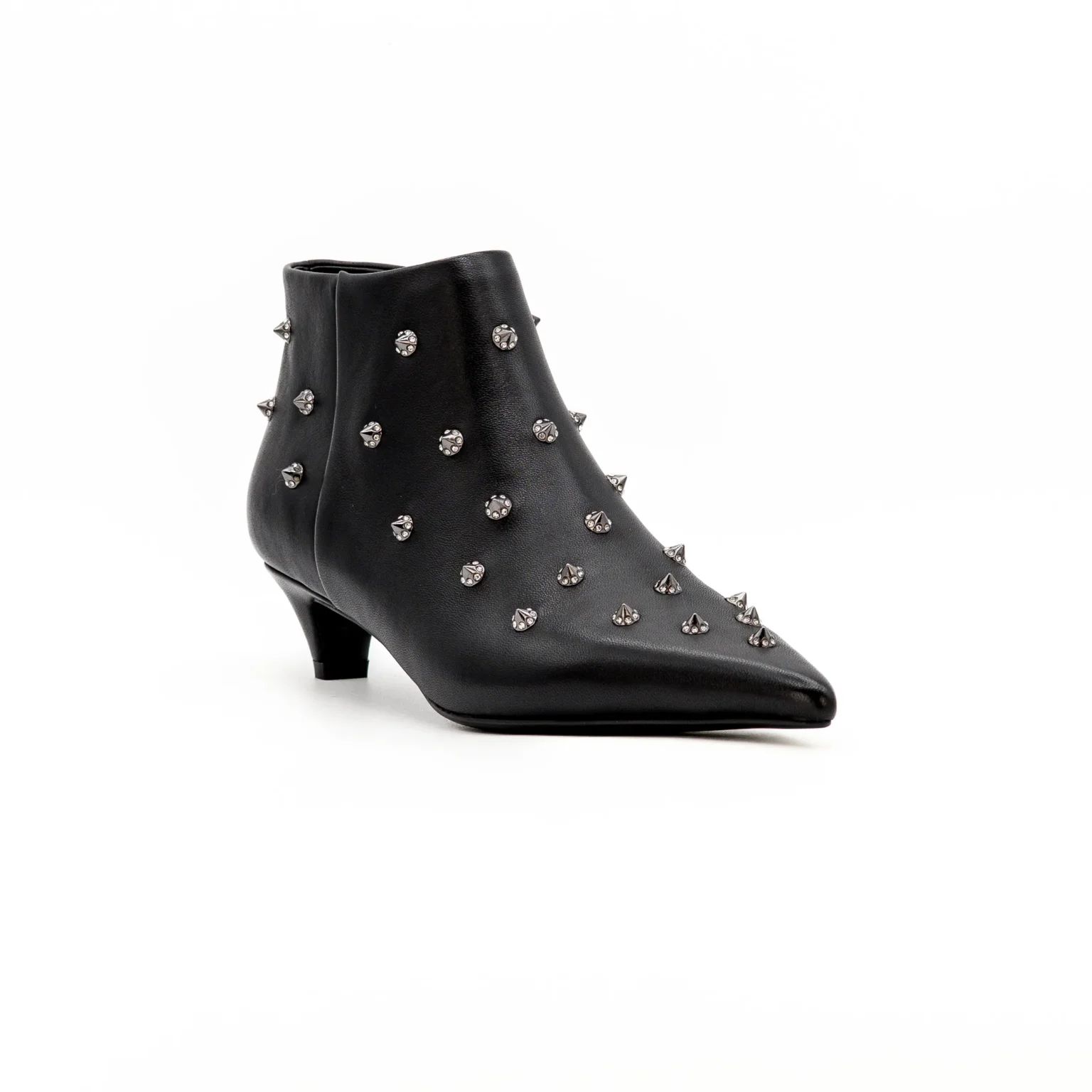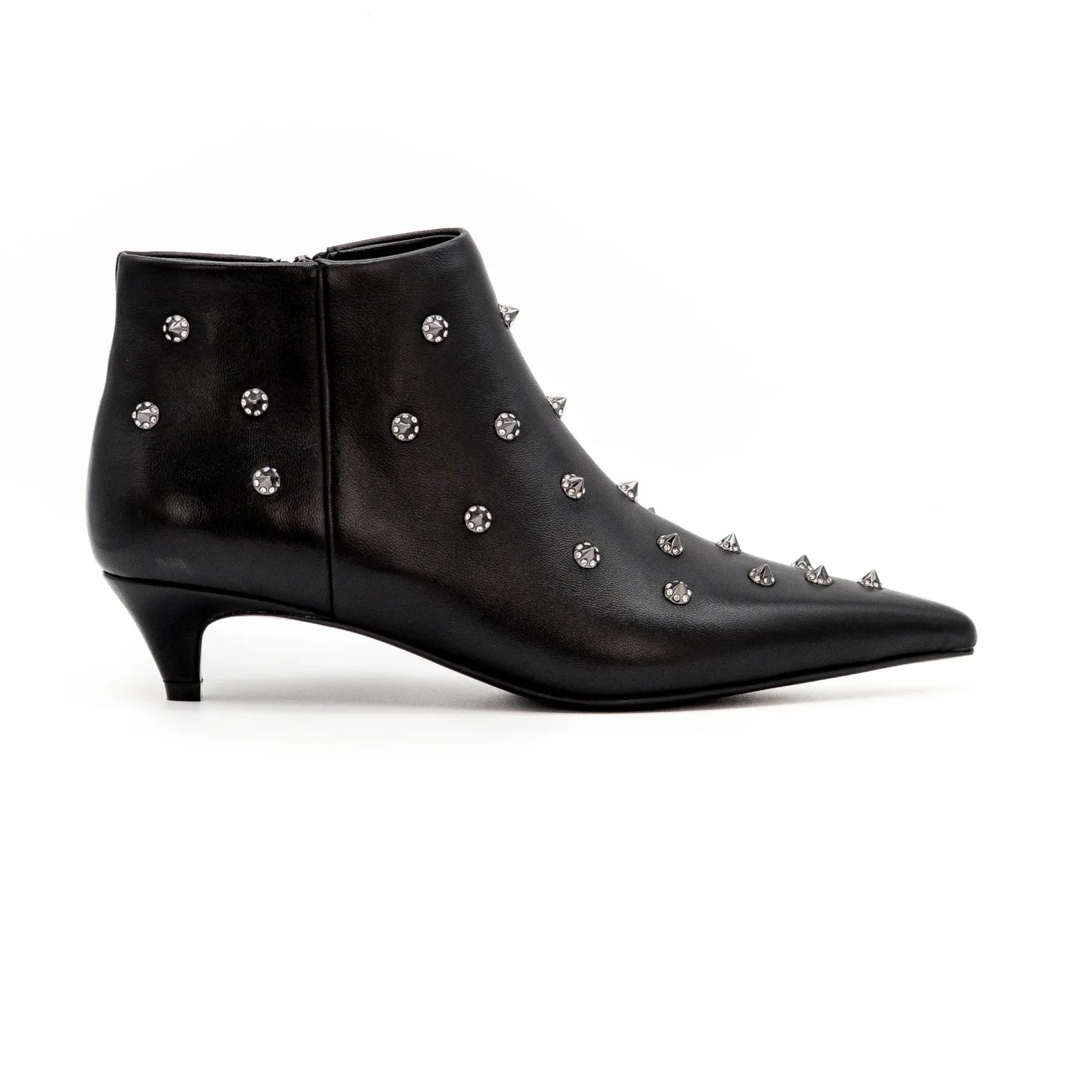 Il modello presenta una punta affusolata e un piccolo tacco a rocchetto, perfetto per garantire comfort senza rinunciare all’eleganza. La tomaia è impreziosita da applicazioni metalliche e borchie con finitura argentata, disposte in modo uniforme per un effetto rock-chic sofisticato. Chiusura laterale con zip per una calzata pratica e veloce.