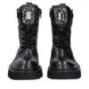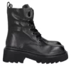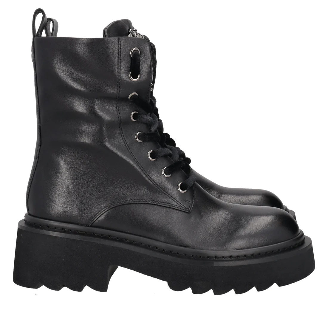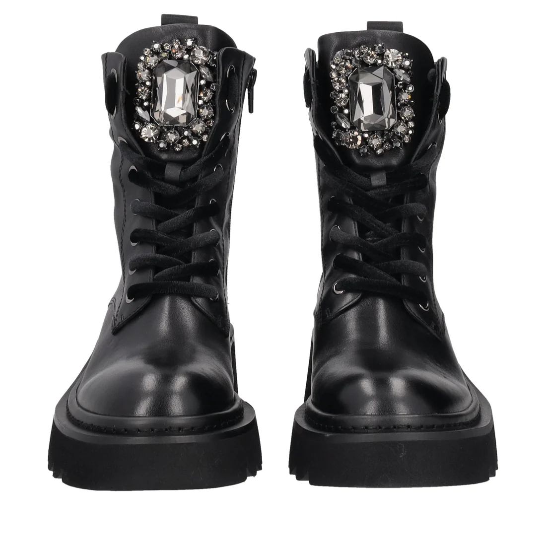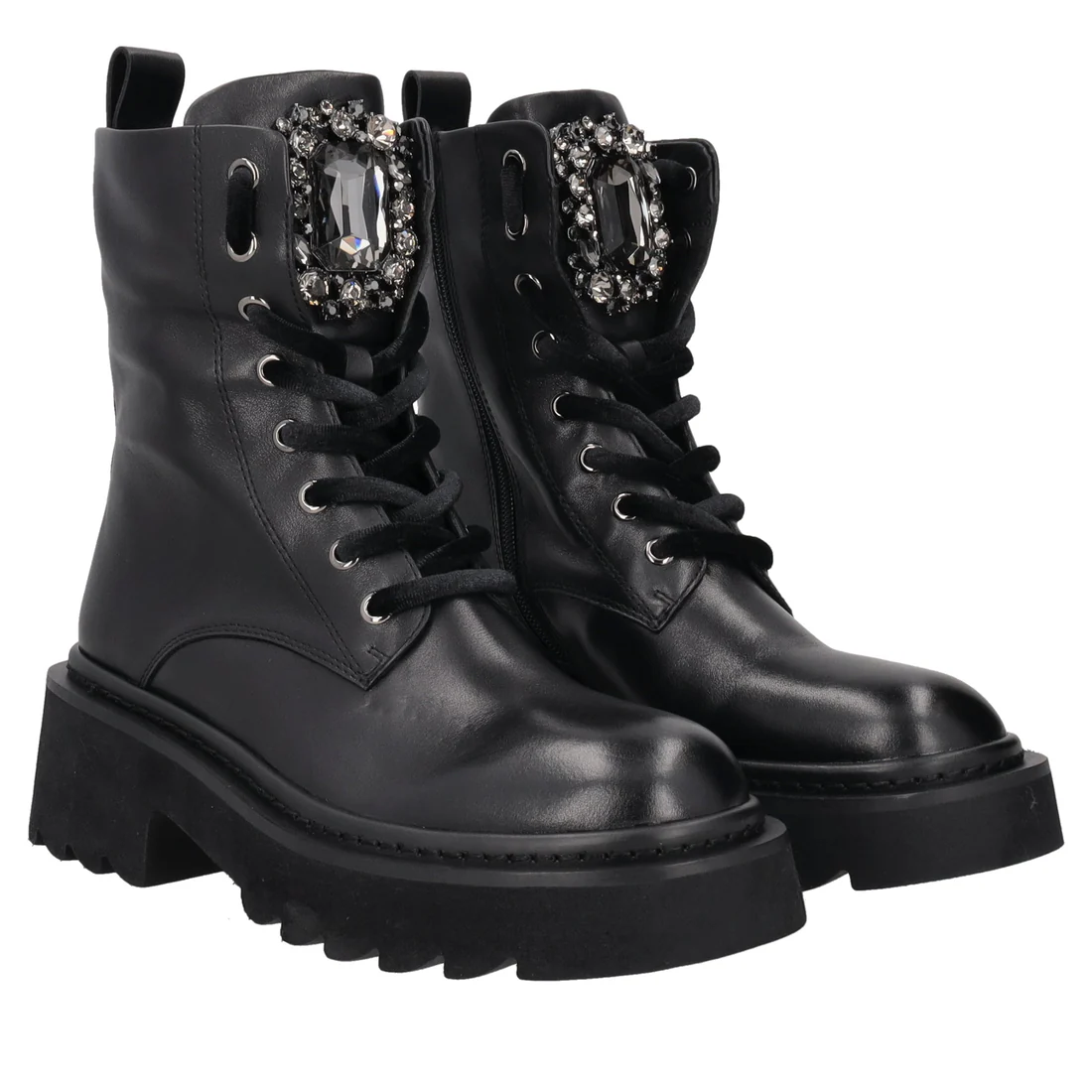 Praticità e glamour si fondono in questi stivali in pelle di Tosca Blu. Realizzati in una palette di nero, questi stivali sono impreziositi da una pietra scintillante e poggiano su una robusta suola carrarmato. Questi stivali in pelle sono una perfetta combinazione di stile e comfort. Indossali con pantaloni in pelle per un look aggressivo e all’avanguardia dalla testa ai piedi.